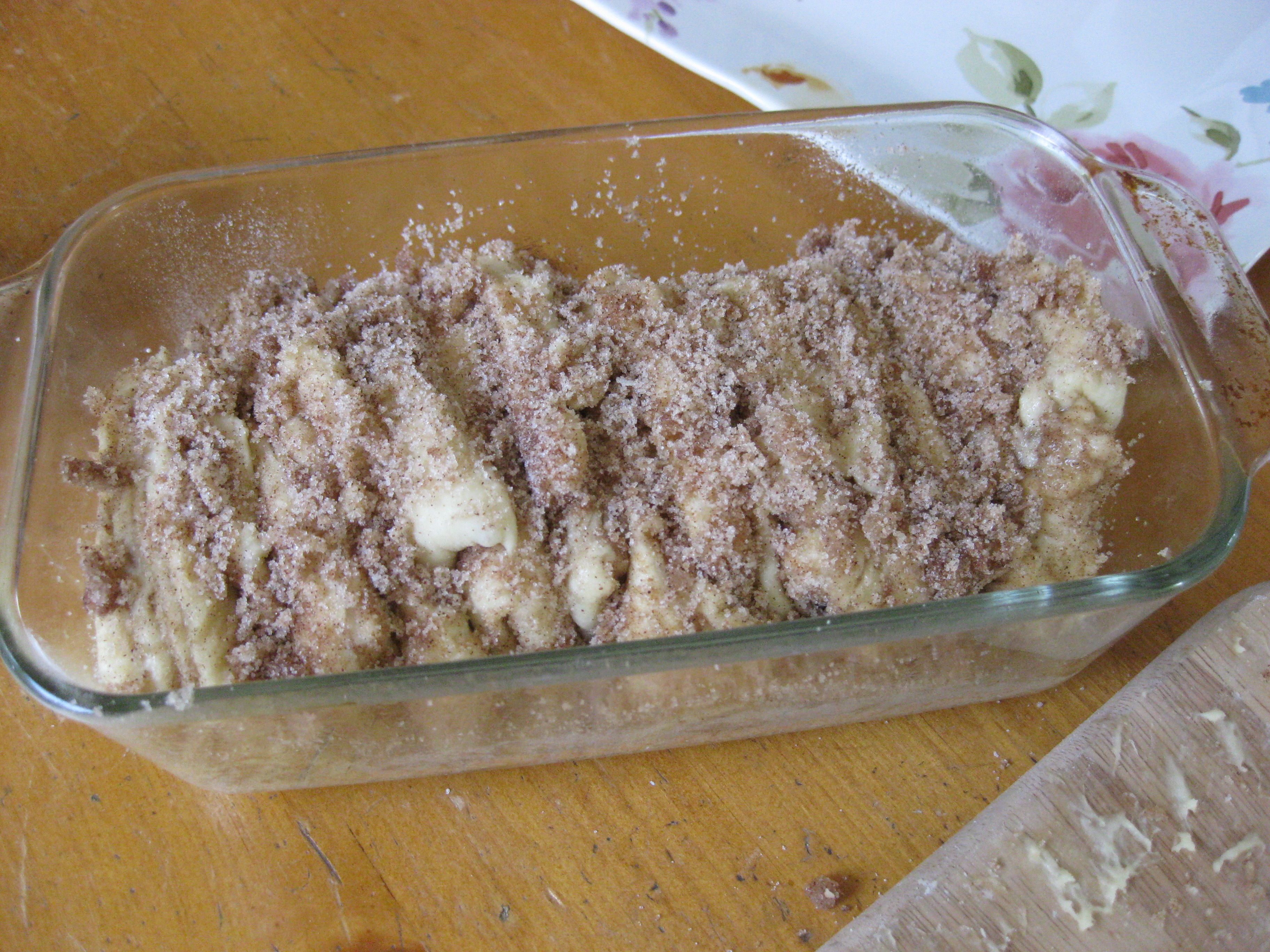 Take those stacks of squares and line them up in your greased and floured loaf pan.  Don’t be gentle with them or they’re not gonna fit.  Really shove them in there.  You’re going to have to squish them.  They’ll be ok.  Then cover it and walk away again.  These puppies need to double in size