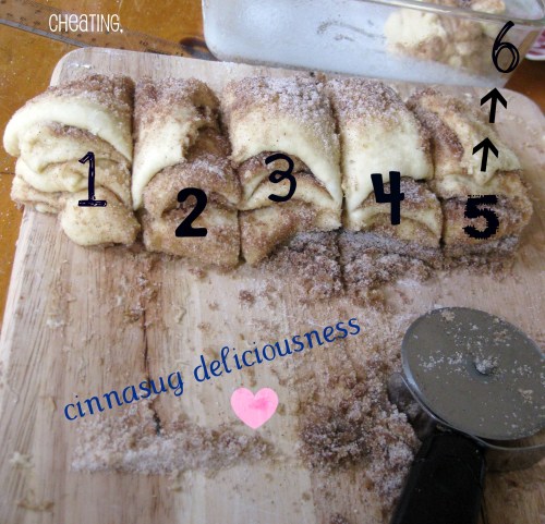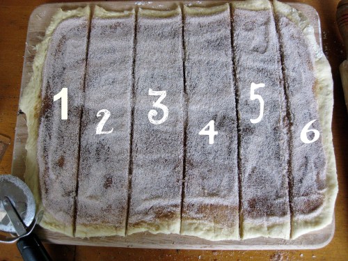 10. Slice the dough vertically into 6 equal strips (I find a pizza cutter works best for this part).  Stack the strips on top of one another.  (Some of the sugar will fall off.  Just sprinkle it on top once it’s in the pan it’s ok.)  Then slice that stack into 6 equal squares.  Y0u’ll have 6 stacks of 6 squares.