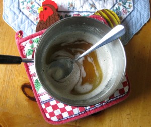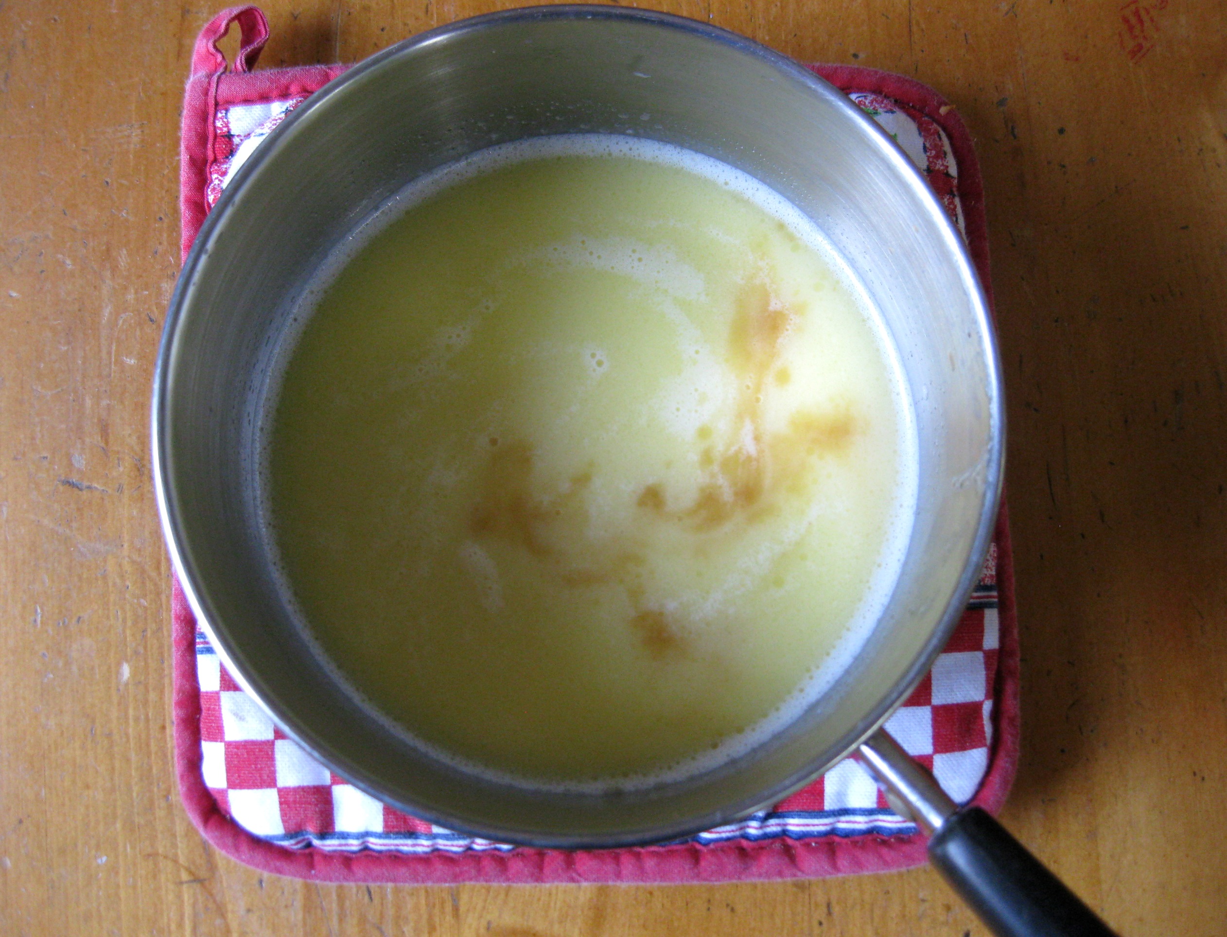 3. In a small saucepan, melt the butter and milk together until the butter has juuuuust barely melted (this isn’t the browned butter part).   Remove from heat and add the water and vanilla extract.  Let it cool off a bit (somewhere between 115-125 degrees F.  Basically-so that it feels warm on your finger but not too hot and it won’t cook the eggs)