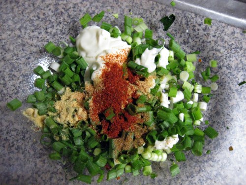 - Combine crab meat, green onions, egg, mayonnaise, dry mustard, crushed crackers, cayenne pepper, garlic powder, Old Bay seasoning, salt and pepper…just throw it all in a bowl and stir. Aren’t those the best recipes!?