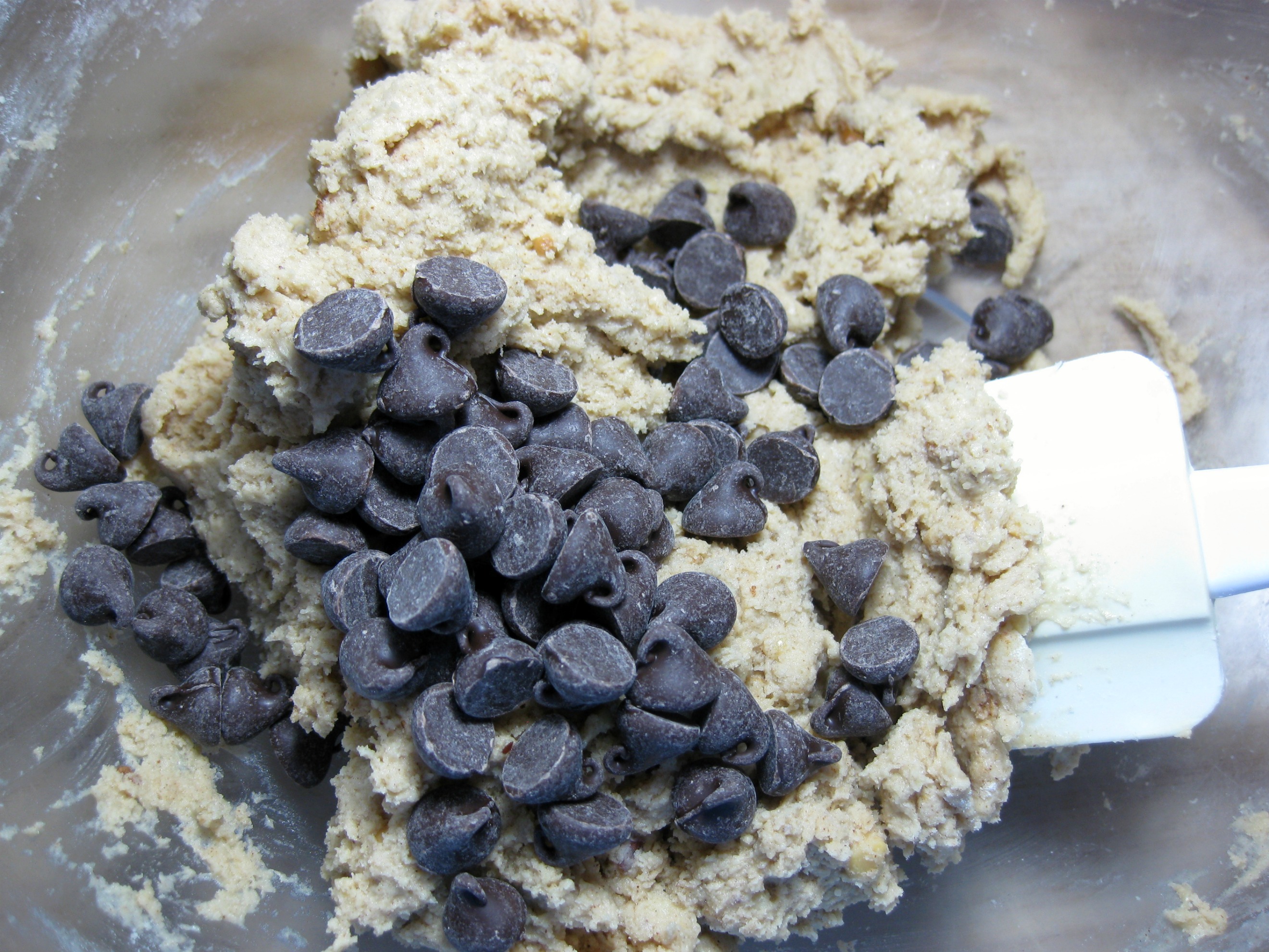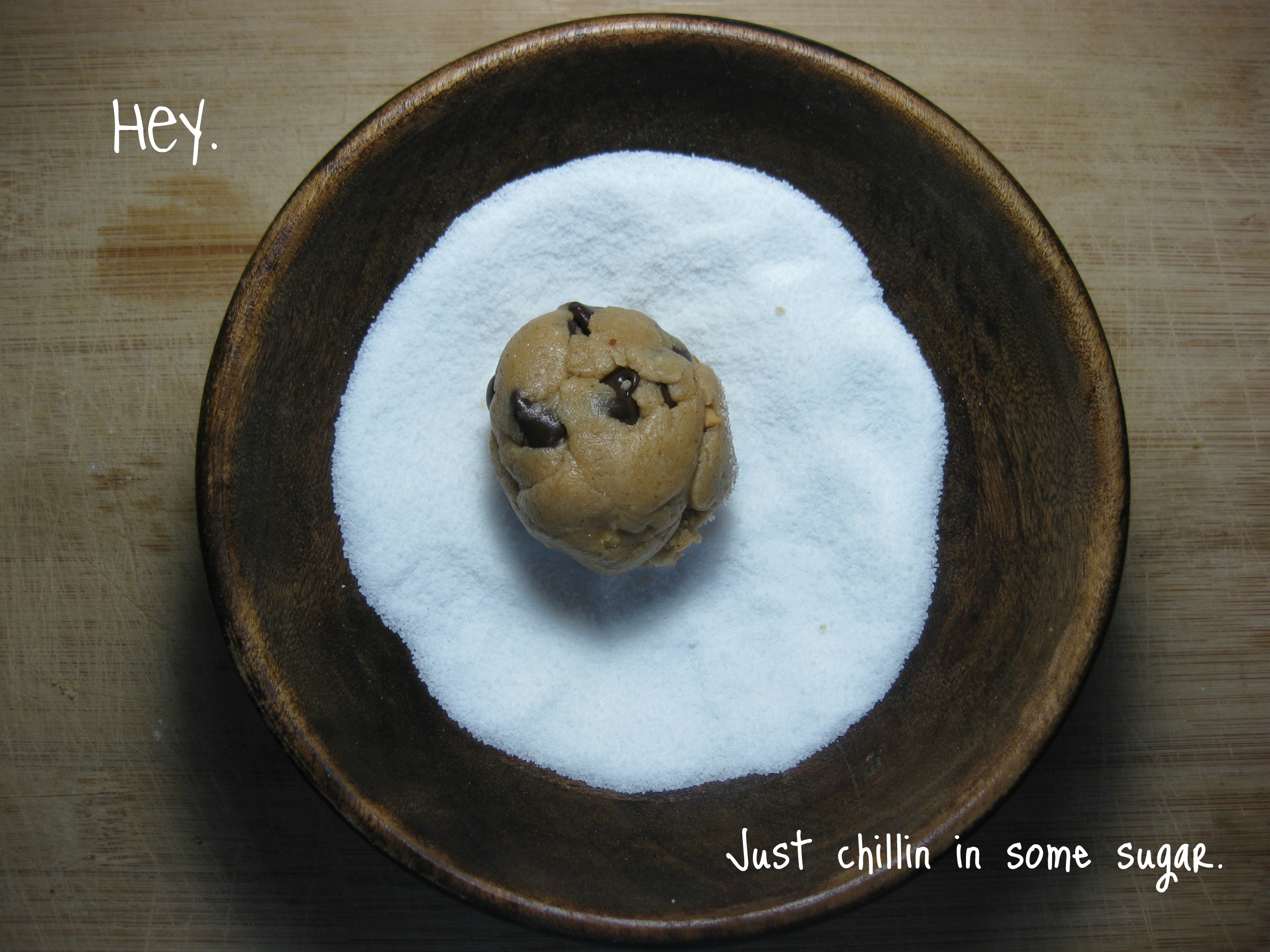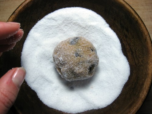 6. Fold in chocolate chips, (as much as you want), shape into one inch balls, roll in sugar and place on an ungreased cookie sheet