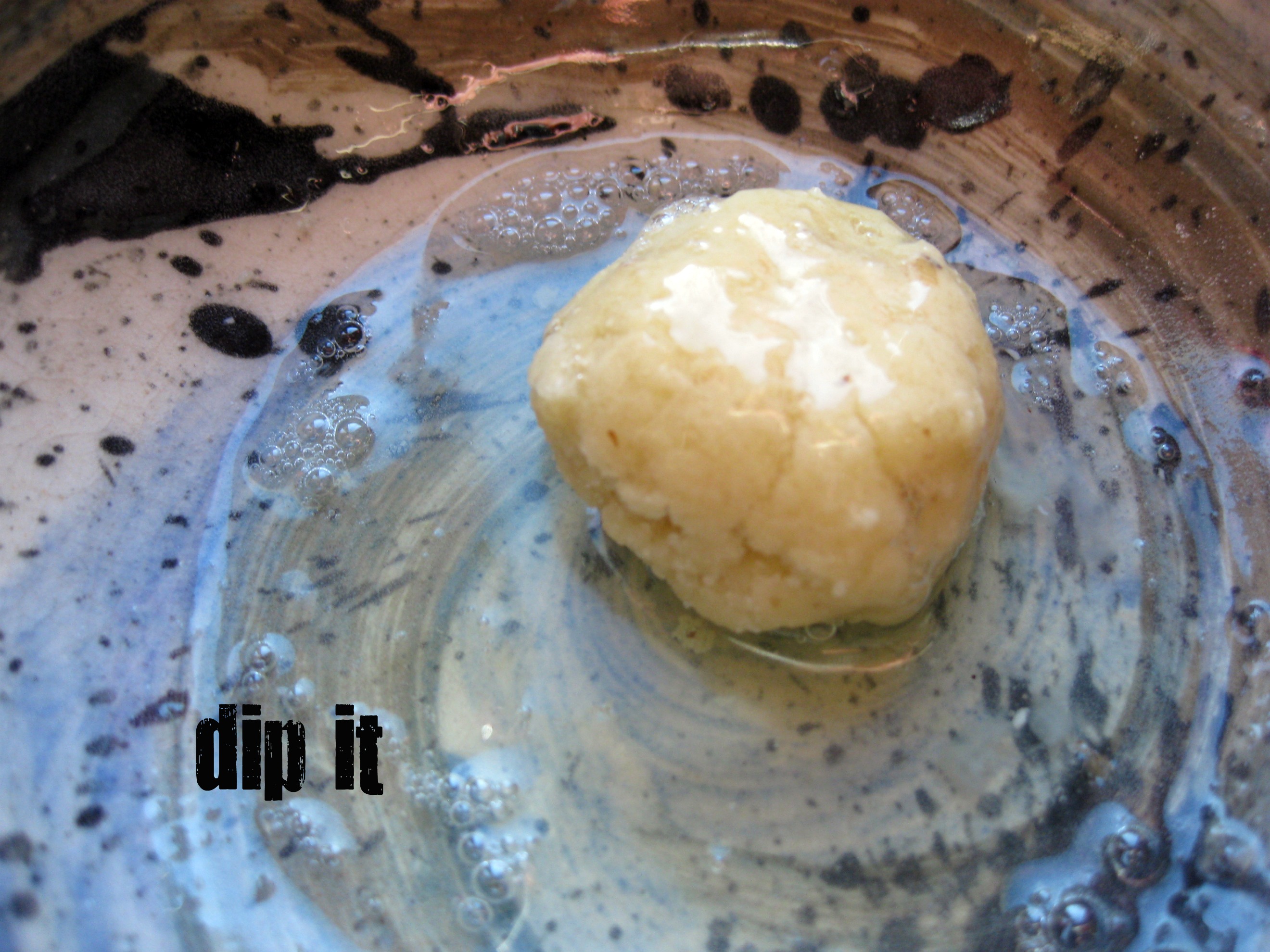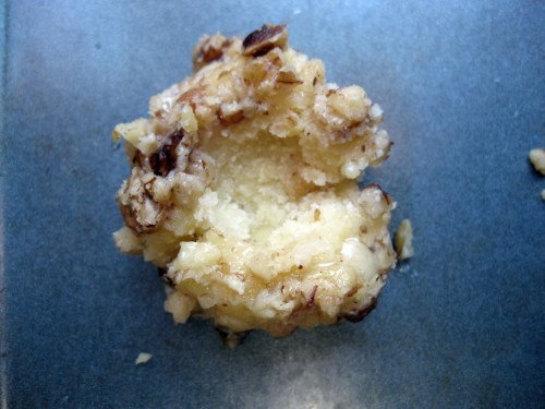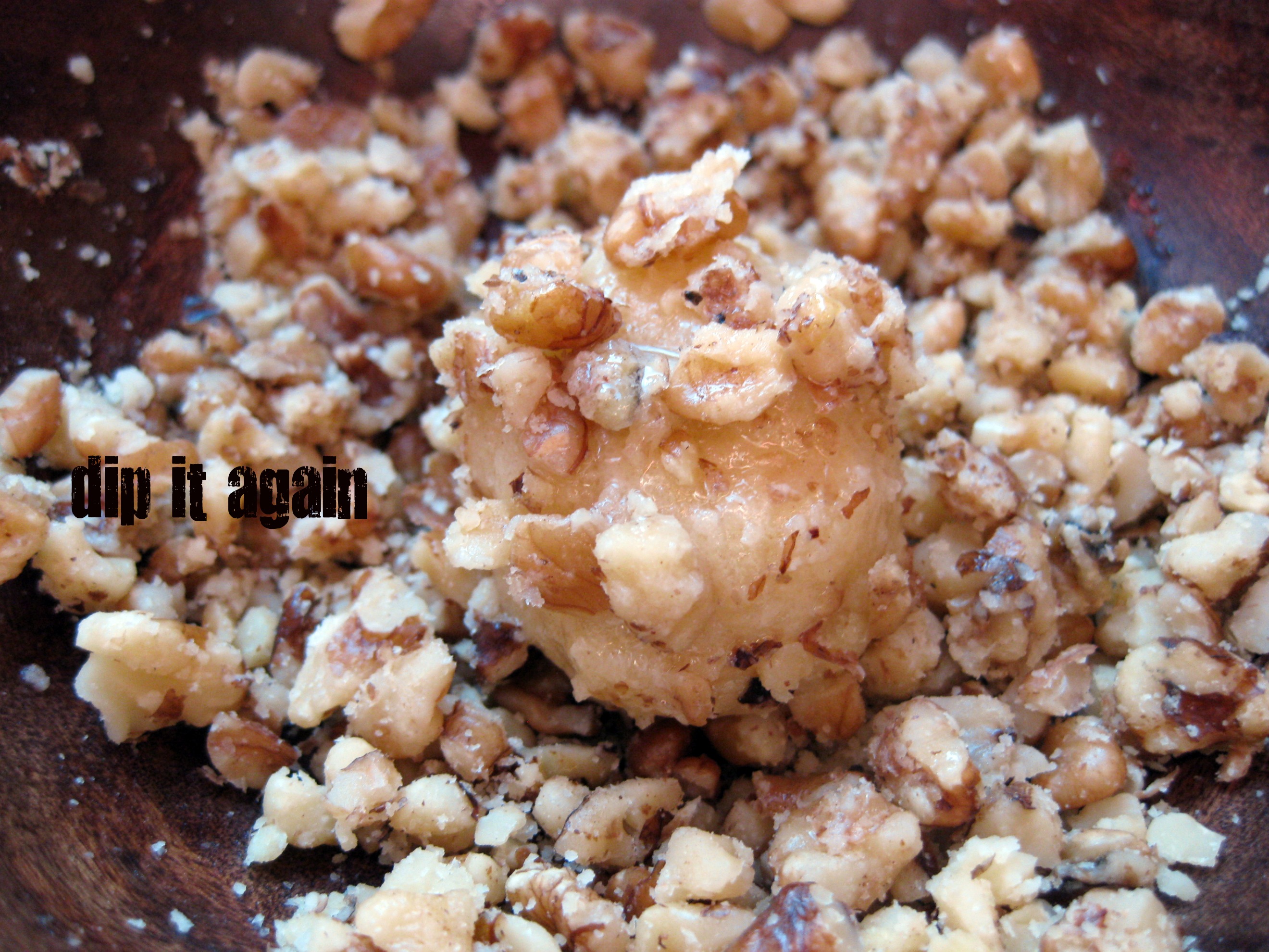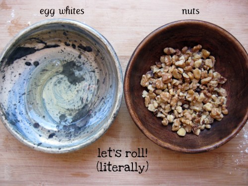 6. Form the dough into balls and roll each one first in the egg whites, then in the crushed walnuts