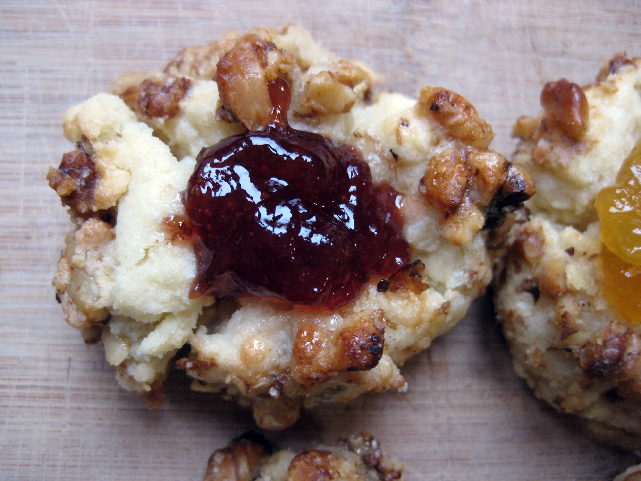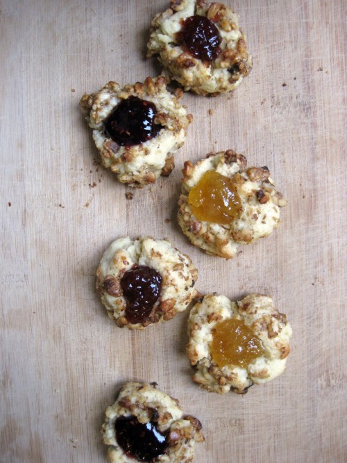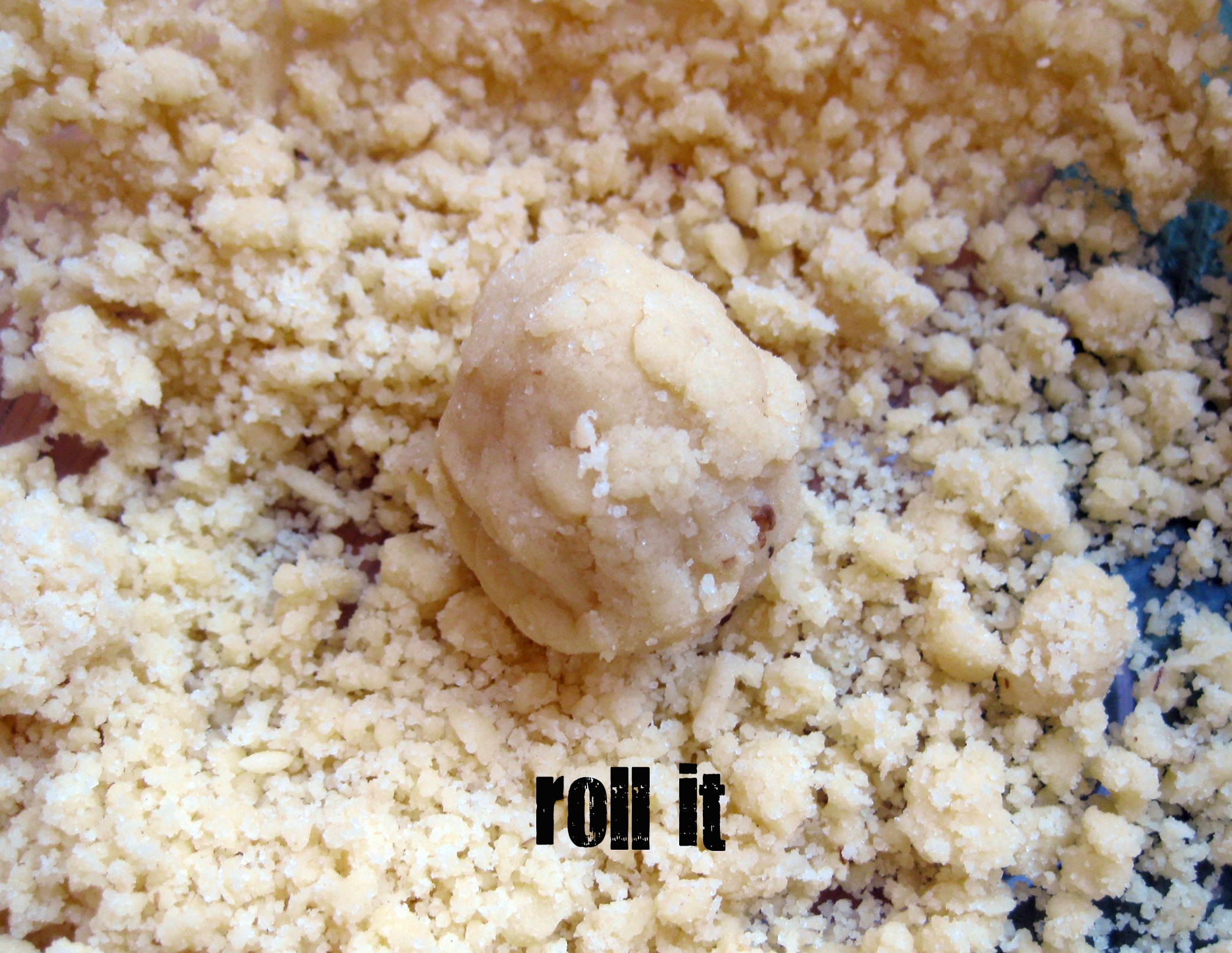 7. Place them on a cookie sheet (they don’t spread) and press your thumb into the center of each one to form a well (which will later hold jam). The cookies may crumble and crack a bit…don’t worry about it too much. If they split in half just gently press them back together…they hold together when baked.