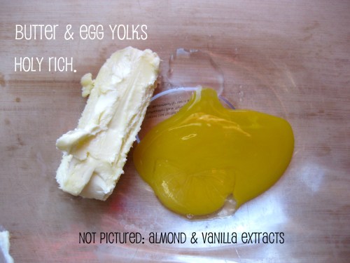 4. Beat egg yolks, butter, vanilla and almond extracts until light and fluffy