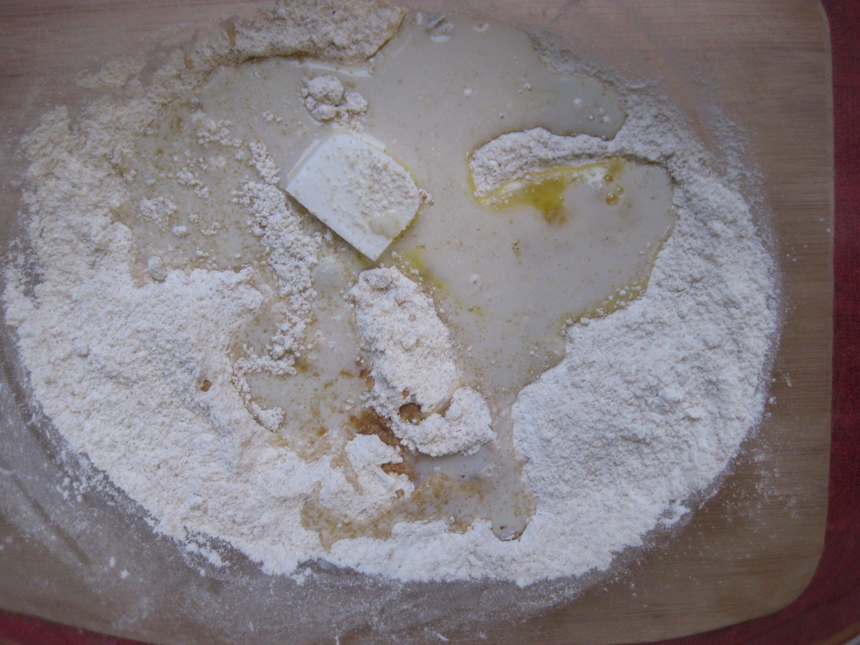 2. Add crisco, egg, vanilla and milk-mix thoroughly, adding flour little by little as you go until it stops being sticky and you have a dense ball of dough that you can easily roll and fold. I usually end up adding about 1/4 to 1/2 cup more but it’s different every time
