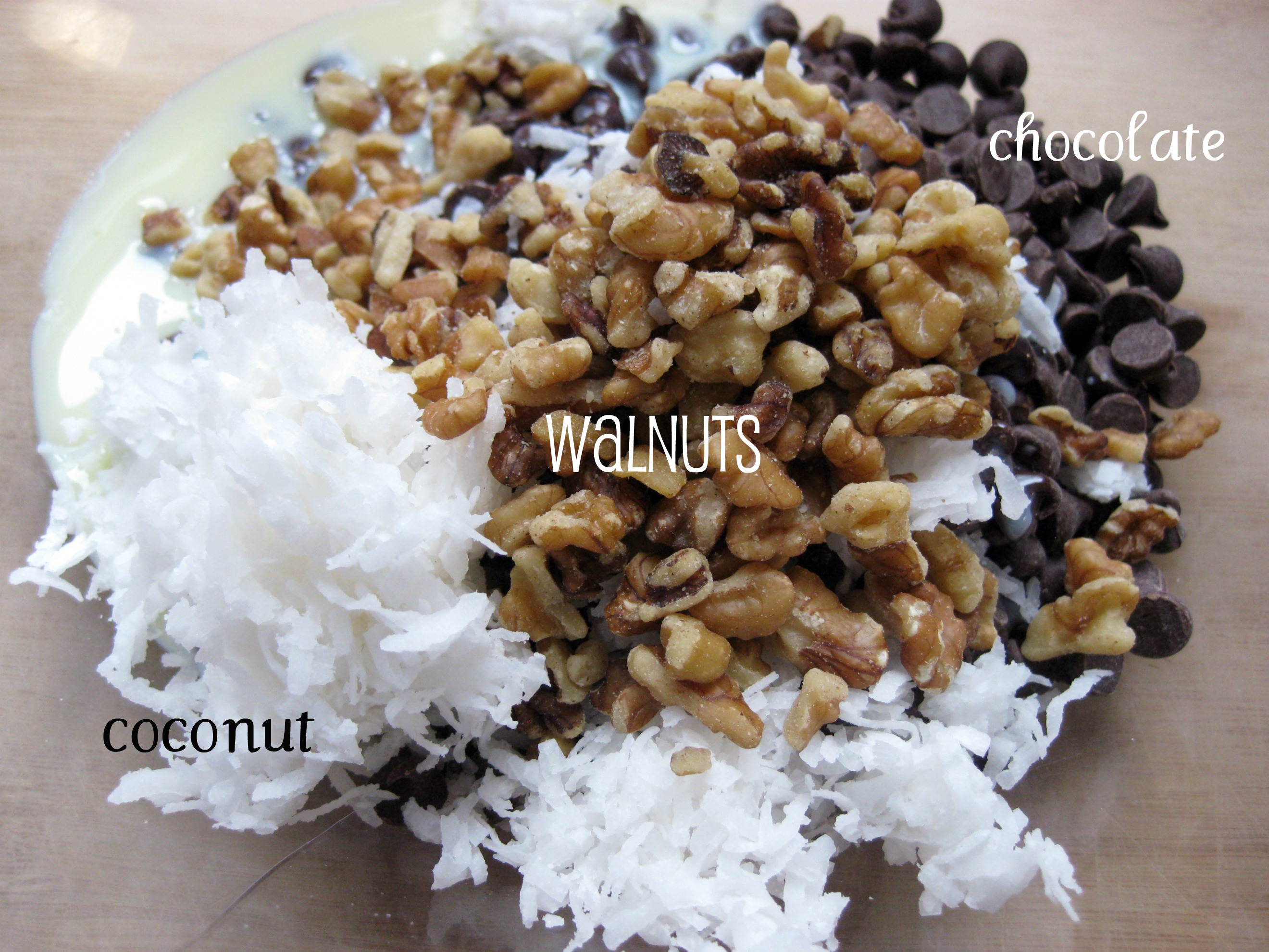 4. While the dough chills, mix the chocolate chips, condensed milk, chopped nuts (I chose walnuts) and coconut in a small bowl). Set aside