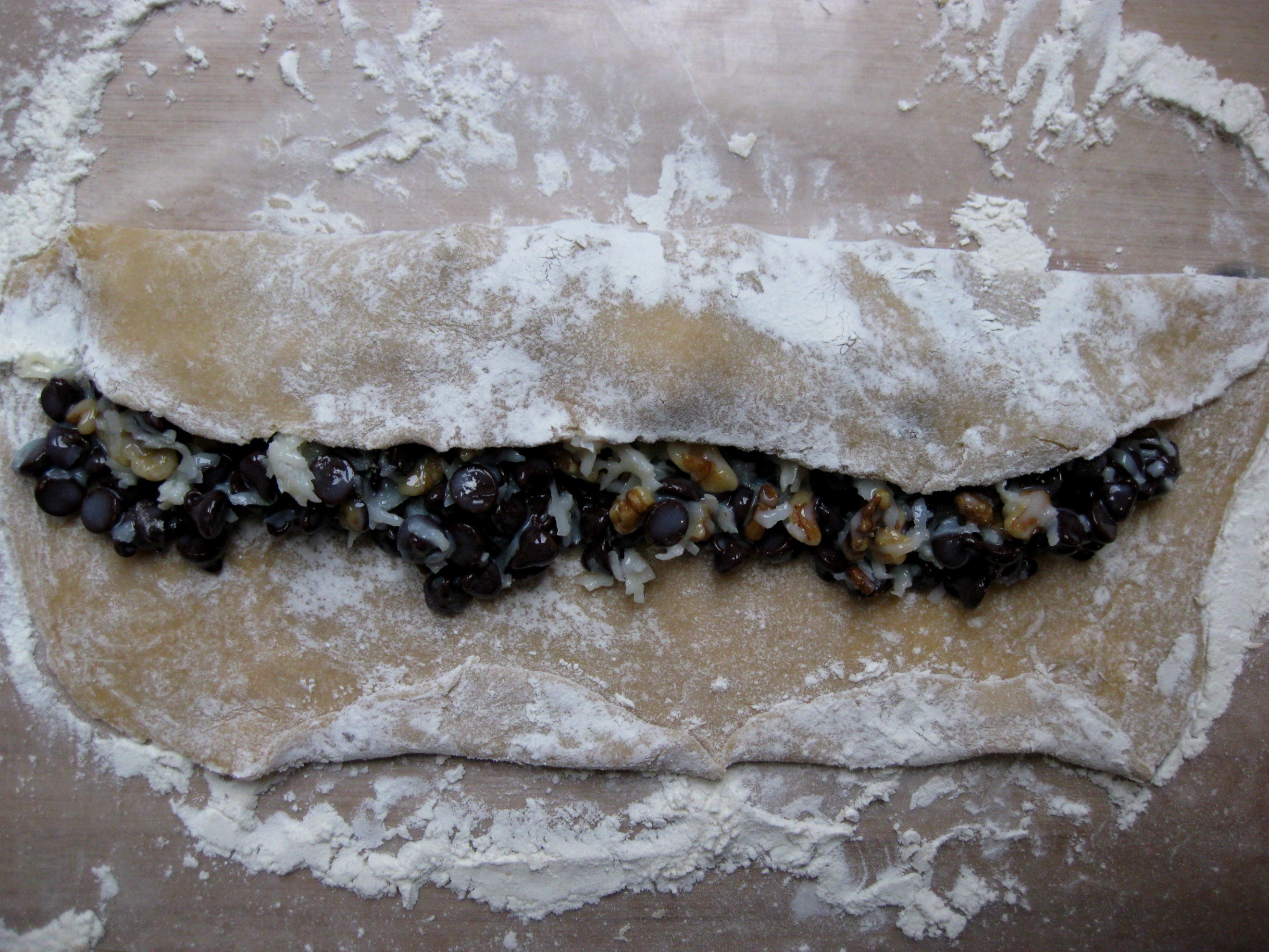 Roll the dough (one section at a time) into a rectangle and spread a line of filling down the middle. Make sure you get all the way to the edges! Those lame end pieces are the worst