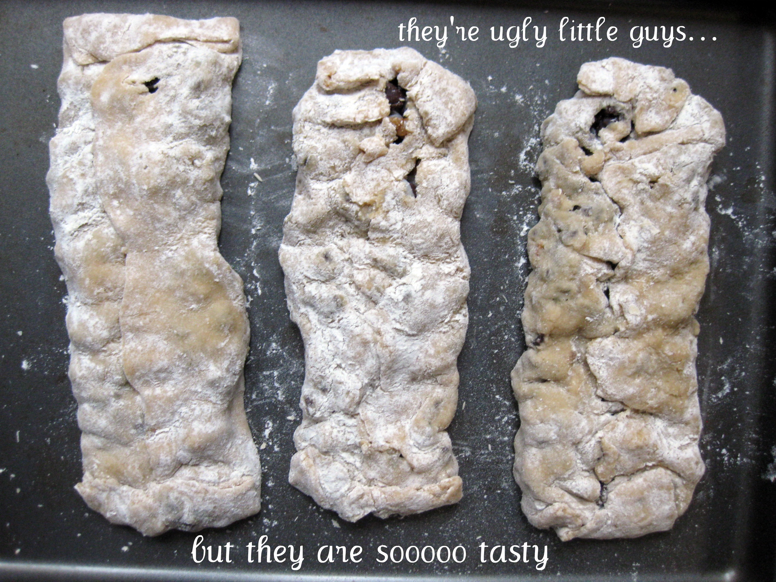 5. Working with one ball at a time, roll the dough into 4″ x 10″ rectangles. (I recommend rolling them on wax paper…less sticking. You’ll still need LOTS of flour) Spread roughly 1/6 of the filling down the center of your rectangle, making sure it reaches alll the way to either end. You want to make sure that when you fold and cut the cookies, you don’t end up with a cookie without any filling