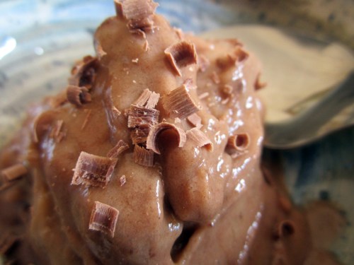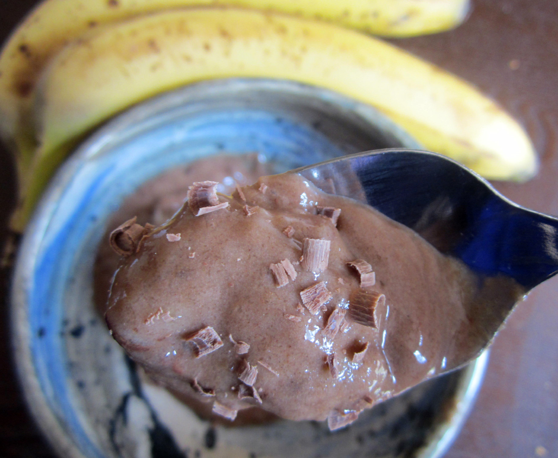 [[Warning: At least the way I made it, (with no sugar and just the slightest touch of chocolate)…you can tell it’s a banana.  I don’t want you to get too excited thinking it tastes EXACTLY like your favorite Dairy Queen concoction.  It definitely tasted like a banana.  As a banana lover, I kinda liked that.]]