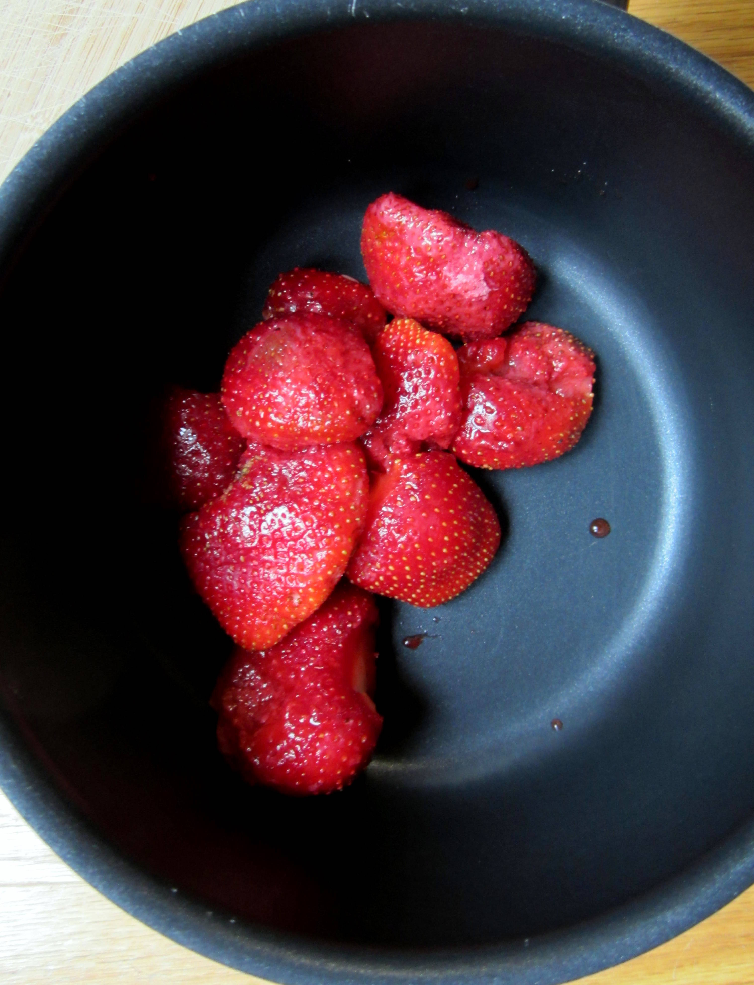 3. Meanwhile, in a small saucepan over medium-low heat, mix the strawberries, sugar, water and balsamic vinegar. You can dice the strawberries if you want more of a sauce but I like the chunks of strawberry so I left them mostly whole. (Huge guys got halved). Let the mixture cook down, stirring occasionally, until you have chunks of strawberry in a thick syrup. For me, this took about 20 minutes