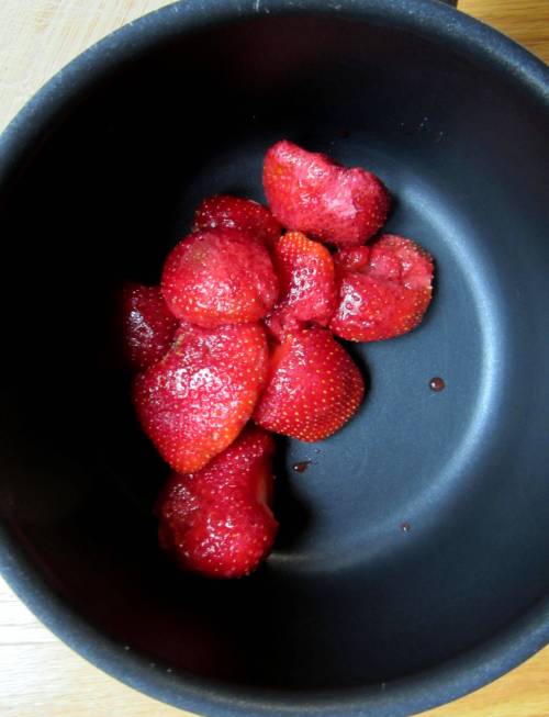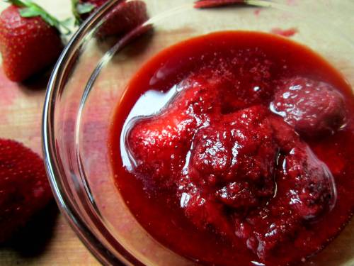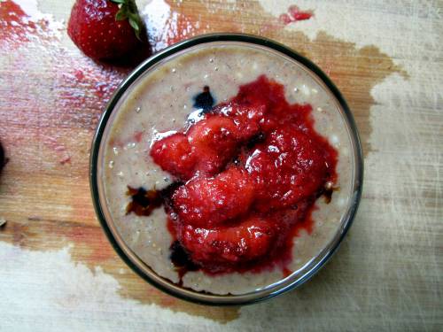 4. Top a serving of rice putting with a couple of strawberry chunks in their syrup. Drizzle some extra balsamic on top and enjoy!