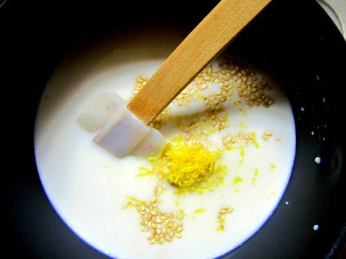 1. In a medium saucepan, bring rice, water, coconut milk, zest, sugar and salt to a boil. Give it a stir, turn the heat way down to low, cover and leave it alone. Cook until the rice completely absorbs the liquid and becomes creamy. Depending on the type of rice you use, times will vary. Mine took a solid hour (listen…good things come to those who wait). It will be creamy and a deep caramel color (if you use the rice I used).
