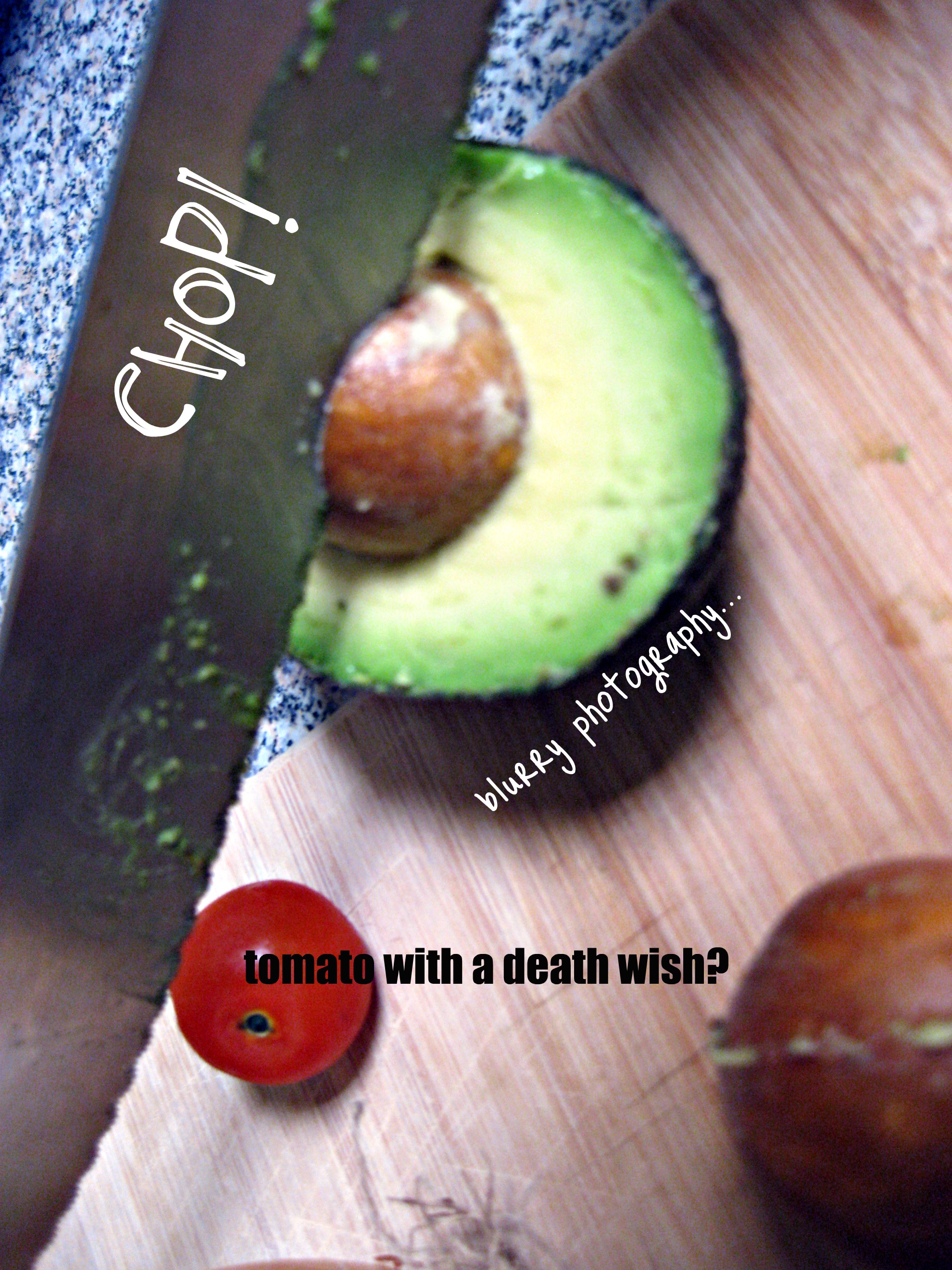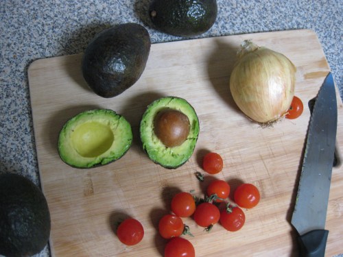 You just need some ripe avocados (we’re goin 4 avocados), an onion, and a handful of cherry tomatoes.