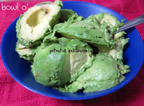 Now just take a spoon and run it between the skin and the meat of the avocado. Pile it up in a super appetizing bowl of green mush! Which we will make delicious.