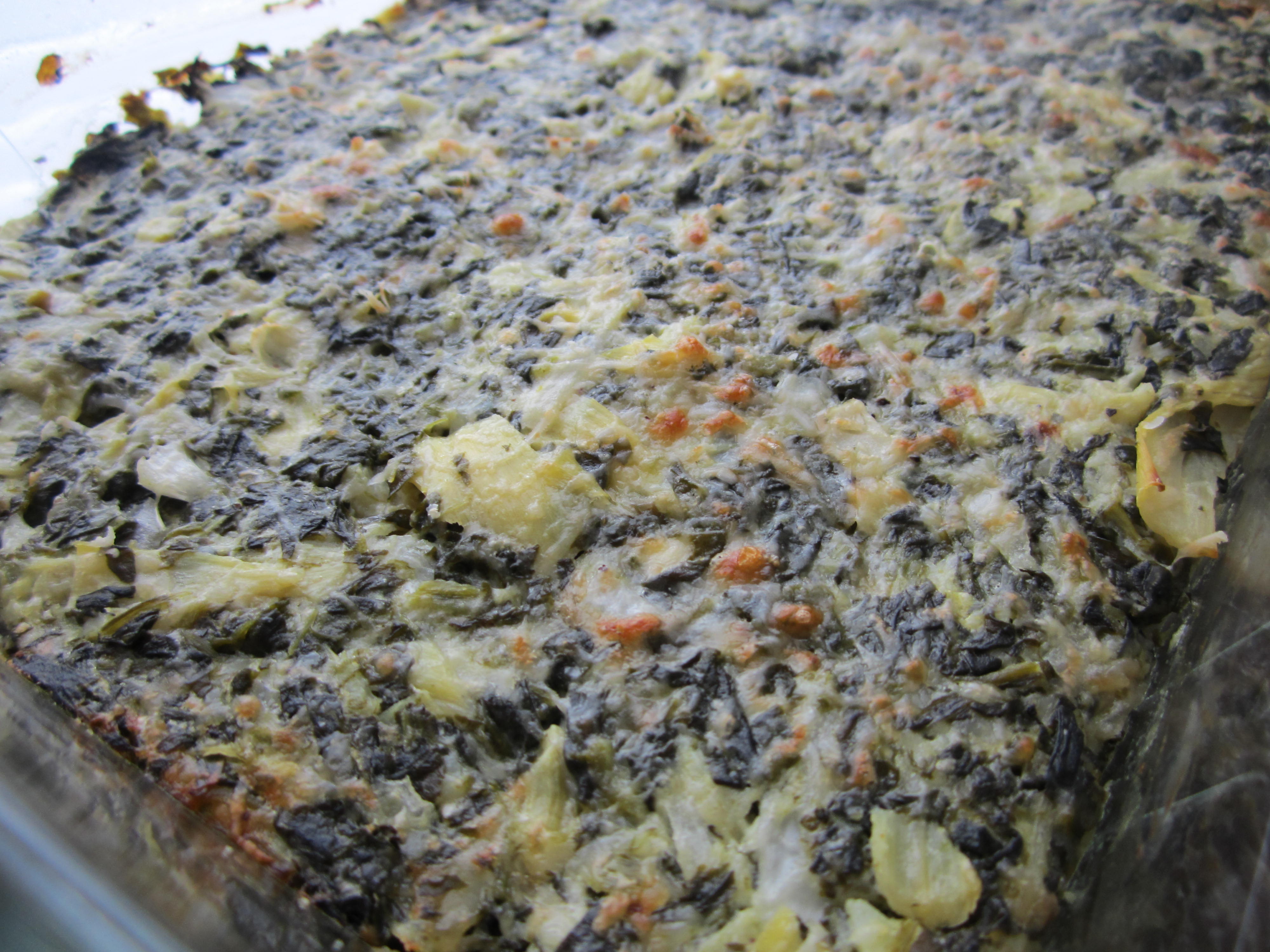 4. Spread evenly in an oven proof dish, grate more Parmesan cheese in a thin layer on top and bake at 375° for 20-25 minutes, or until hot, lightly browned and cheese is melted.