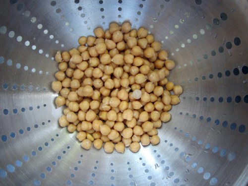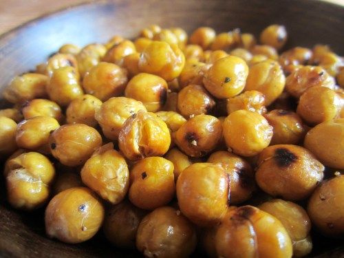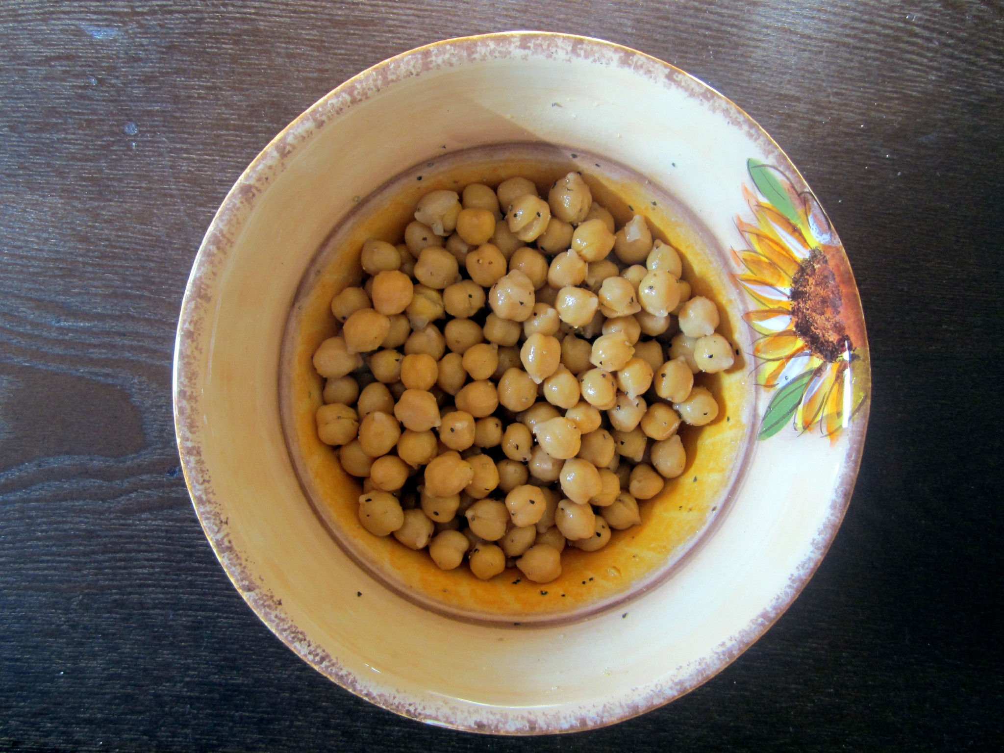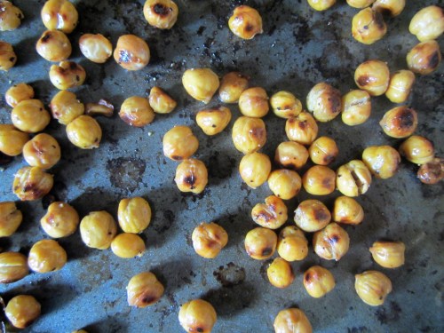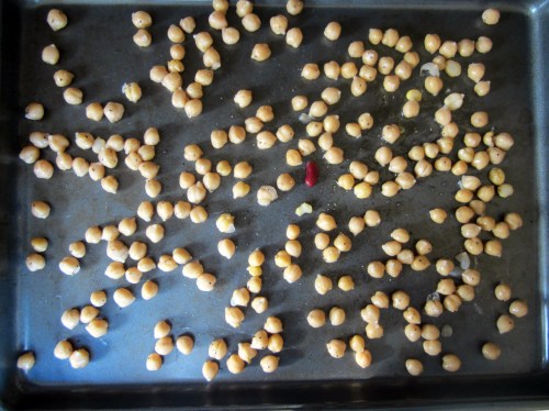 6. While the jalapeno roasts, drain, rinse and thoroughly dry chickpeas.  Spray with a light coat of olive oil, sprinkle with salt and maybe some cumin if you’d like and arrange in a single layer on a baking sheet.  Roast for 15-20 minutes or until as crunchy as you want (longer=crunchier..they could be just like corn nuts).  More detailed directions for roasting chickpeas can be found here.
